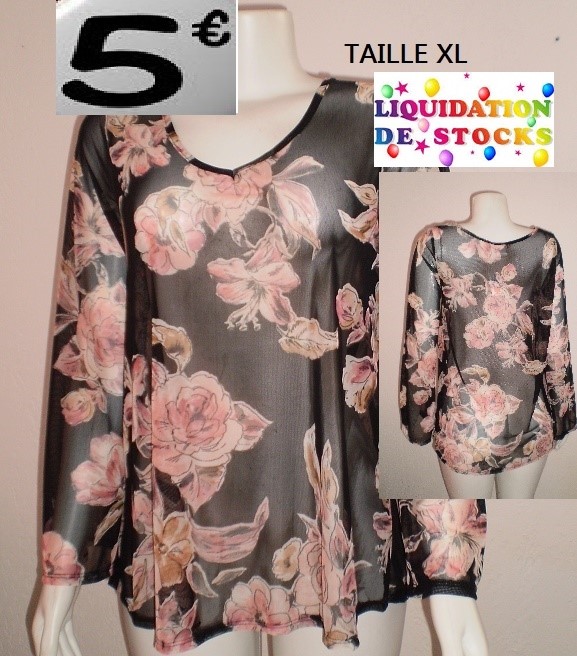 HAUT FLEURI FOND NOIR A MANCHES TAILLE XL