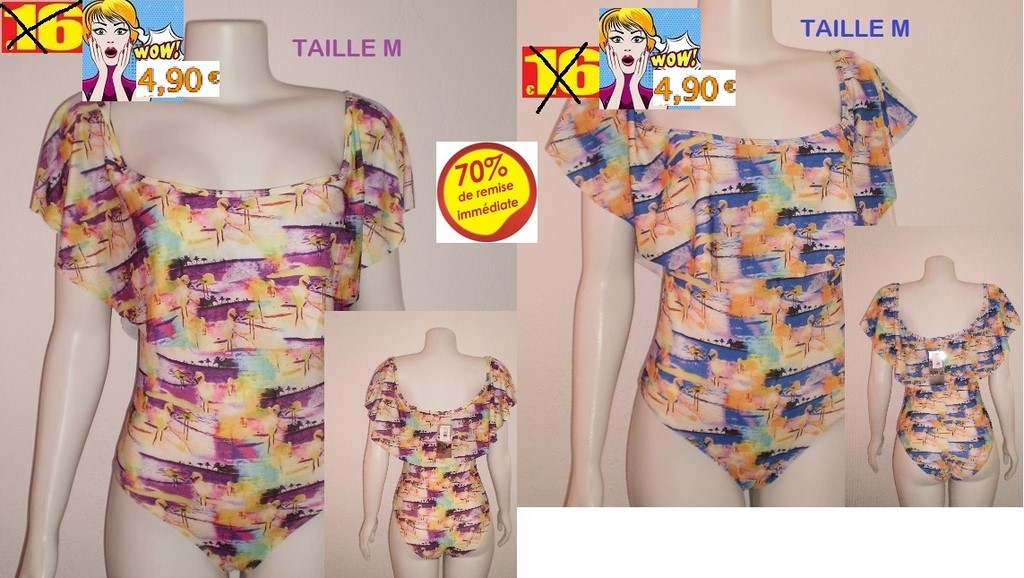 MAILLOT 1 PIECE FLAMANTS ROSE FOND MAUVE ou BLEU TAILLE M
