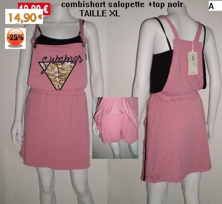 combi short salopette rose+top noir taille XL