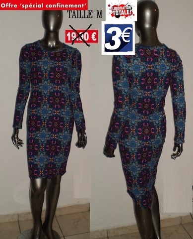 ROBE BLEU/ROSES FLUO A MANCHES TAILLE M